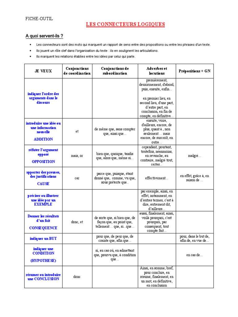 Tableau Connecteurs Logiques Fle